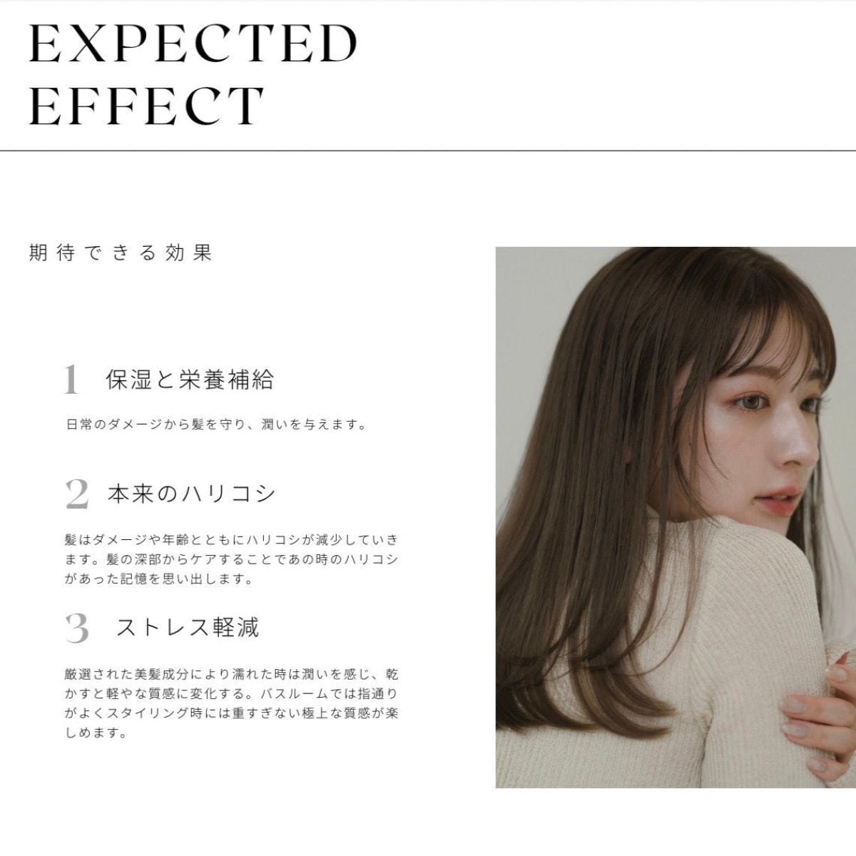 水、セテアリルアルコール、シクロペンタシロキサン、アモジメチコン、ステアリン酸グリセリル、ヒドロキシプロピルグルコナミド、グルコン酸ヒドロキシプロピルアンモニウム、ぺヘントリモニウムクロリド、ステアルトリモニウムクロリド、ジメチコン、ココジモニウムヒドロキシプロピル加水分解ケラチン(羊毛)、(ジメチコン/ビニルジメチコン)クロスポリマー、ジメチコノール、ポリクオタニウム-10、BG、クエン酸、イソプロパノール、ニンニク根エキス、ローマカミツレ花エキス、ゴボウ根エキス、アルニカ花エキス、セイヨウキズタ葉/茎エキス、オドリコソウ花/葉/茎エキス、オランダガラシ葉/茎エキス、セイヨウアカマツ球果エキス、ローズマリー葉エキス、メチルイソチアゾリノン、フェノキシエタノール、赤227、香料
