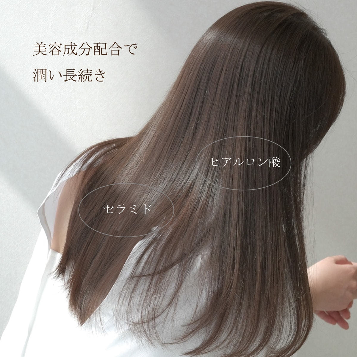 水、セテアリルアルコール、水添ポリイソブテン、ヒドロキシステアリン酸エチルヘキシル、べヘントリモニウムクロリド、ステアリン酸グリセリル、ジメチコン、アモジメチコン、香料、ステアルトリモニウムクロリド、イソプロパノール、BG、ヒアルロン酸Na、セラミドEOP(セラミド1)、セラミドNP(セラミド3)、セラミドAP(セラミド6II)、クエン酸、ラウロイルラクチレートNa、フィトスフィンゴシン、コレステロール、カルボマー、キサンタンガム、フェノキシエタノール、メチルパラベン、プロピルパラベン